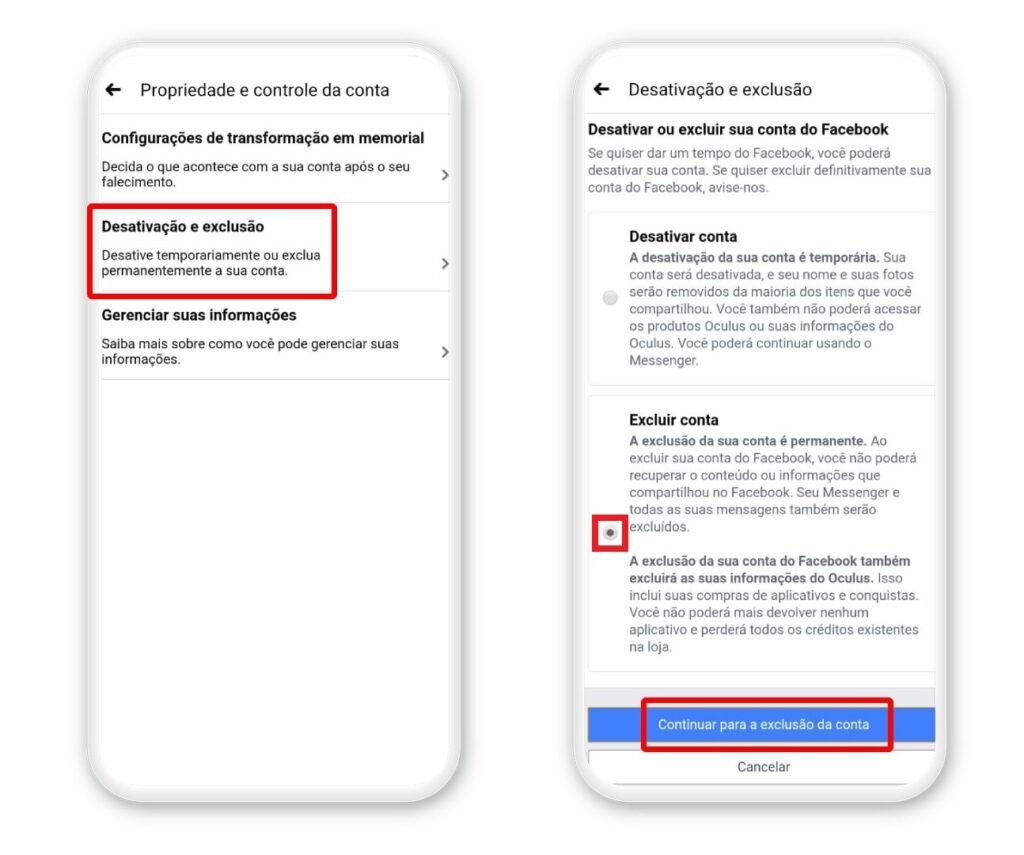 Agora você deve clicar em “Desativação e exclusão” e selecionar a opção “Exclusão“. Para seguir, toque em “Continuar para a exclusão da conta“.