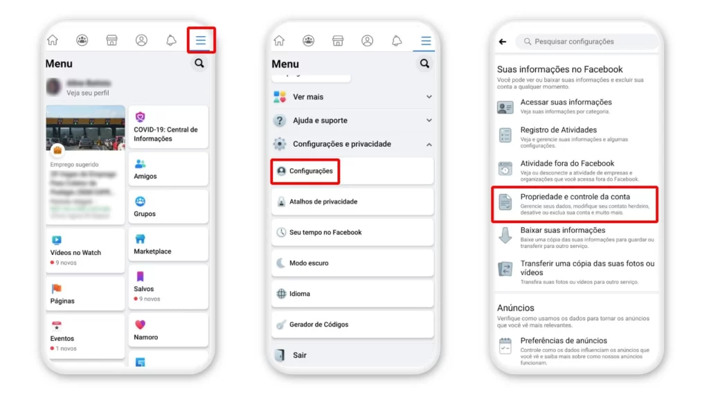 Em seguida, role a tela até encontrar a aba “Suas informações no Facebook” e selecione “Propriedade e controle da conta“.