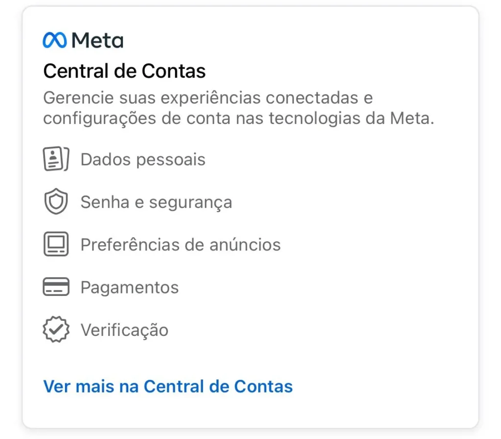 Em seguida, toque em “Ver mais na Central de contas”. No site do Facebook, esta opção está localizada na barra lateral esquerda e, ao tocar nela, você será direcionado para a Central de Contas.