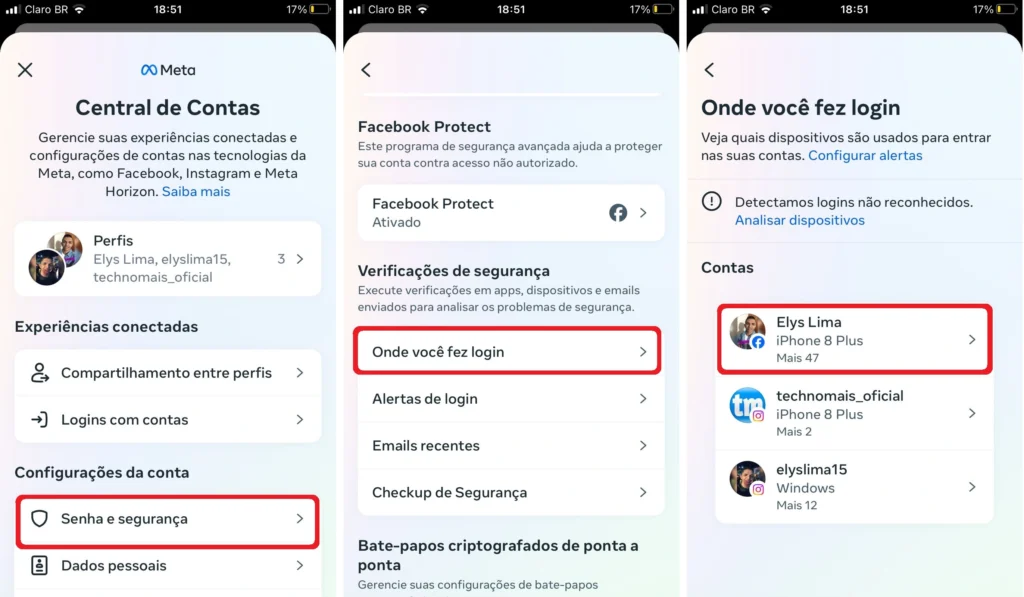 Em Central de contas, navegue até “Senha e segurança”. E em seguida, toque em “Onde você fez login” e você verá as contas conectada no aparelho, e toque na conta que gostaria de ver os dispositivos conectado, ou seja, “Facebook“.