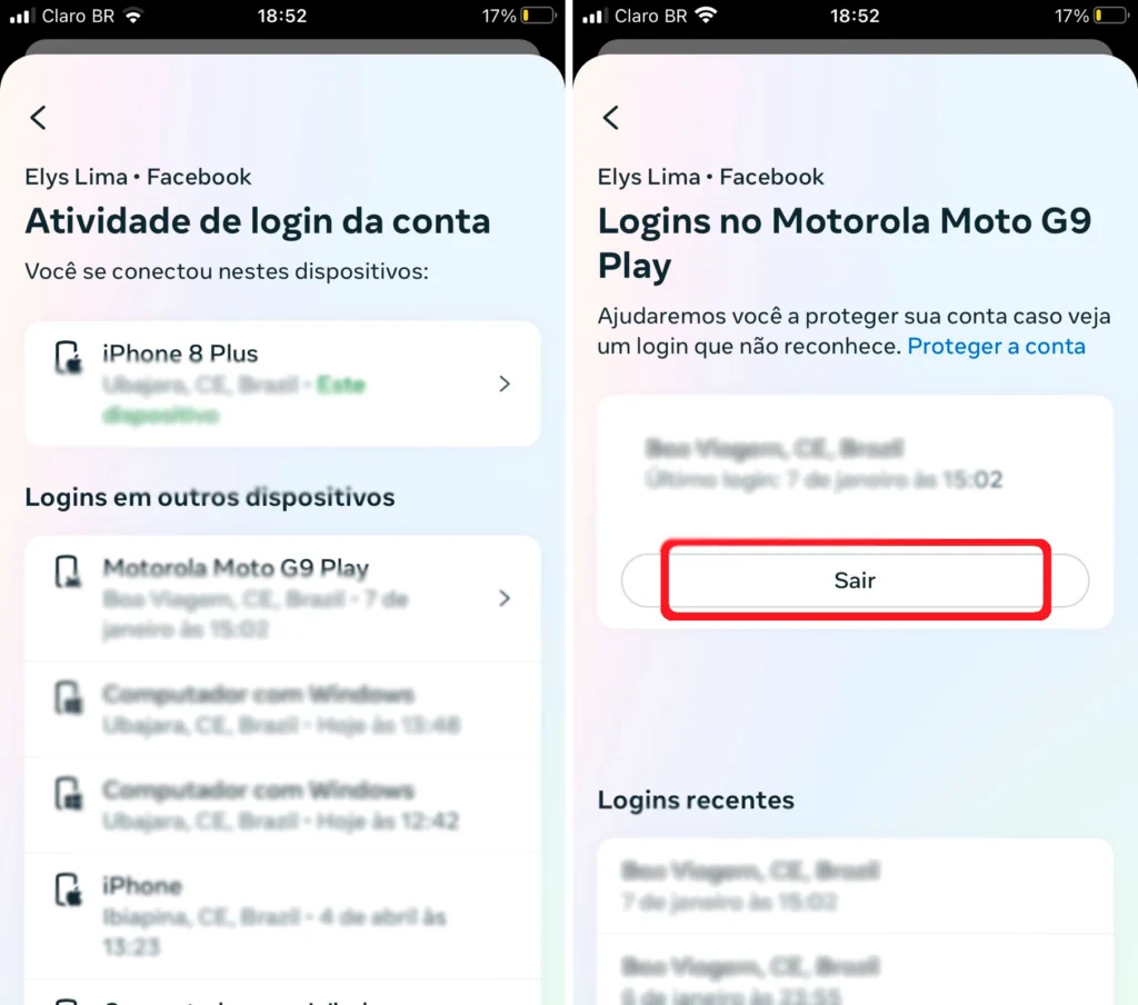 Para remover o acesso de um dispositivo suspeito, clique em cima do “Dispositivo suspeito” e em seguida toque em “Sair“. Essa ação encerrará a sessão.